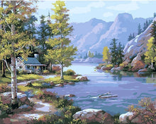 Beautiful scenery - Mountains, River, trees and rest house Paint by number